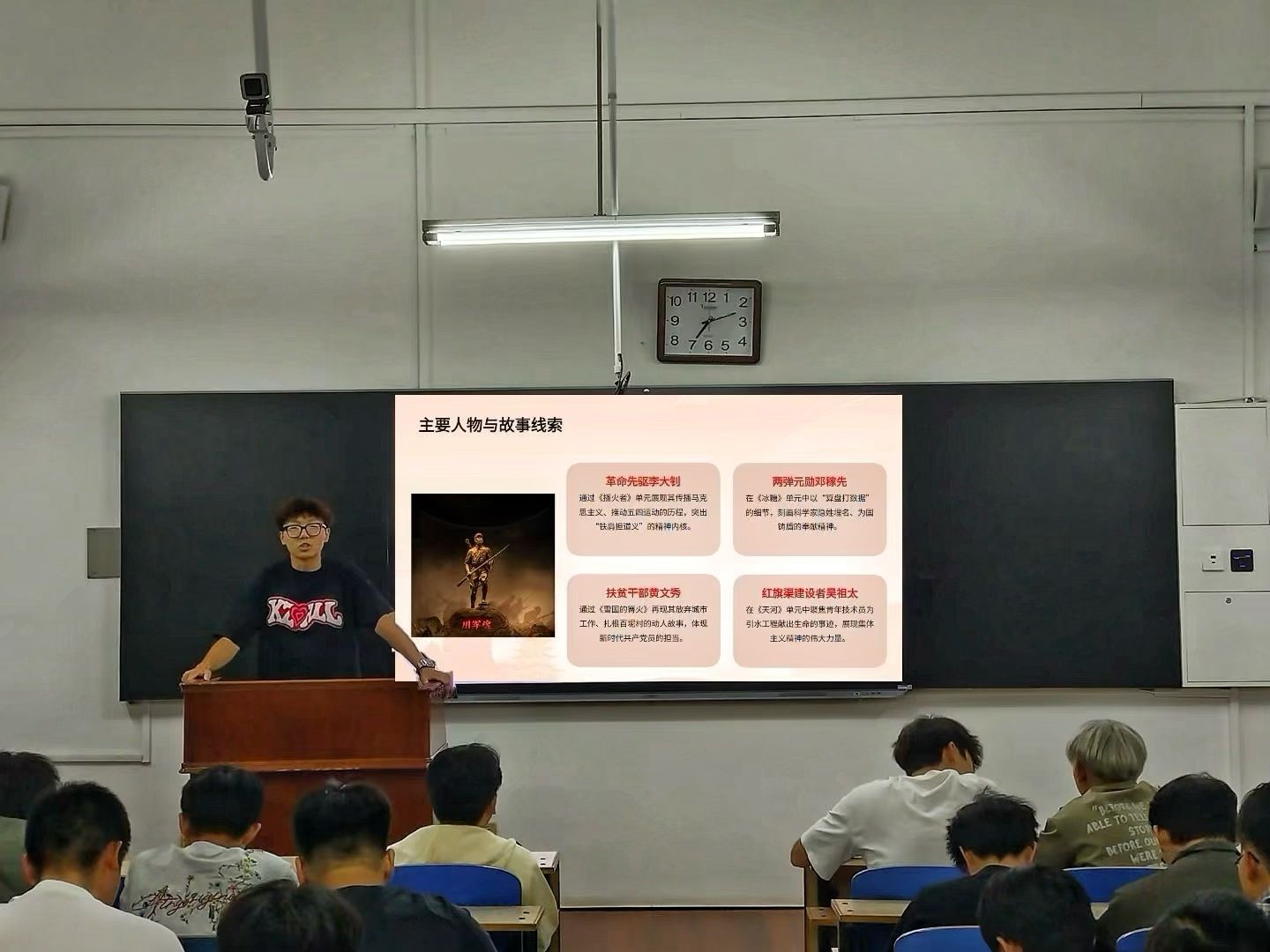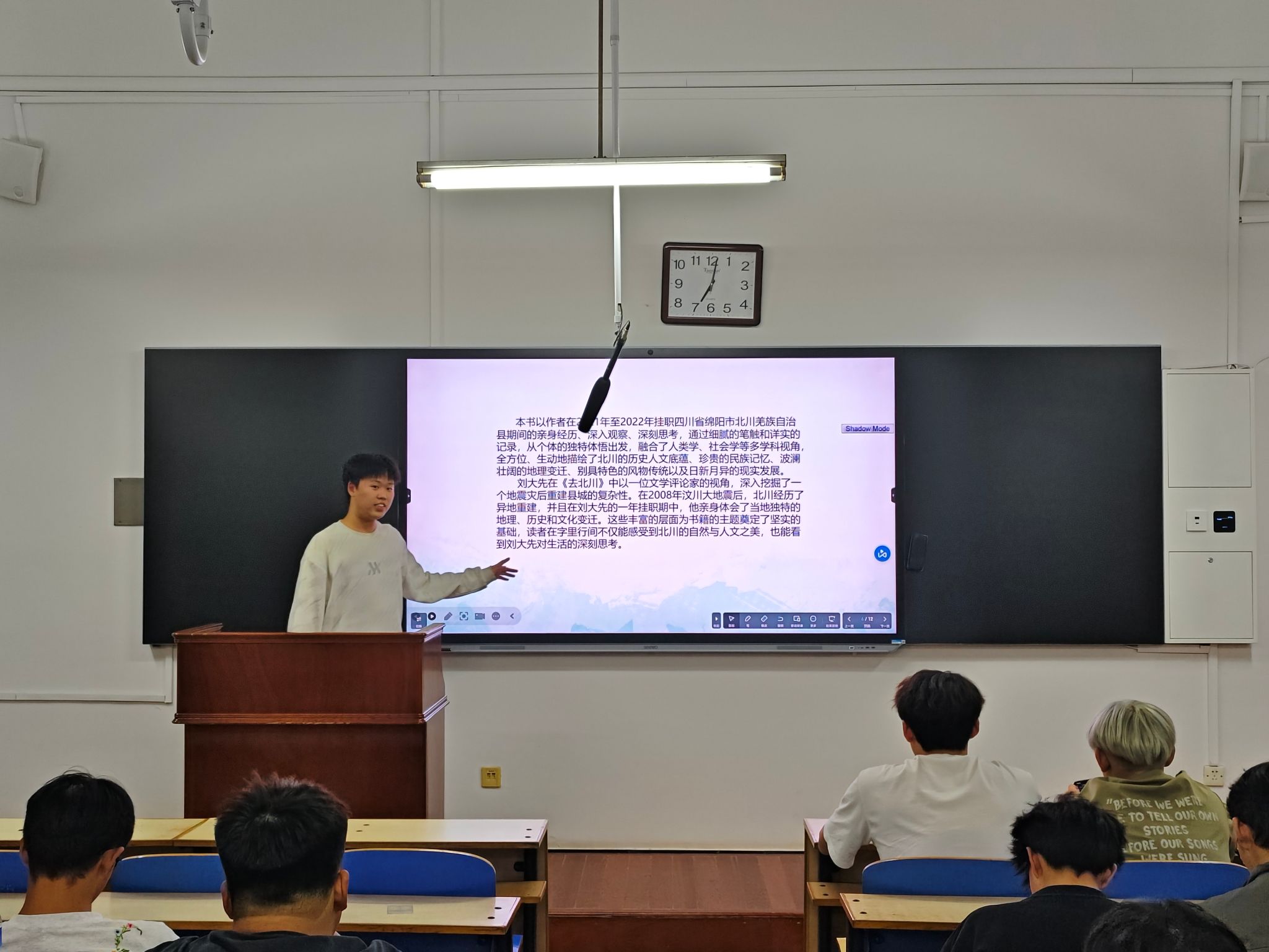 吴欣昊围绕《理想照耀中国》解读,以书中不同时代的追梦故事为核心,介绍了各行业奋斗者为理想拼搏的经历,引导同学们感受理想力量;王思远聚焦《去北川》,在梳理作者刘大先学术背景与创作脉络的基础上,结合书中羌族文化传承者、灾区重建工作者的真实案例,全景呈现北川灾后重建中文化保护与发展的艰辛。